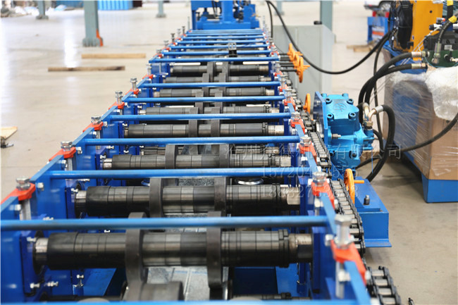 C型钢成型机又叫C型钢檩条机,是冷弯行业压型机品种的其中一种,是一种基础性冷弯机种类。它是液压马达驱动,功率大,生产;生产的产品多用于钢结构建筑框架檩条使用,该设备采用PLC编程电脑控制,可加工80-300之间的任意规格C型钢,成型后电脑控制自动冲孔并切断,机器操作简单便捷。 无极切断C型钢设备剪切介绍:该设备采用液压无极切断的方式,其优点在于:当我们换型生产的时候,无需换剪切刀片,该剪切装置可适用于多种型号,因此无极切断,又称为剪切。 另我公司还配备有抛丸打砂除锈设备,我厂生产的全部设备均经过抛丸除锈处理,机器在自然环境下生产时,不易生锈,从而延长机械的使用寿命。