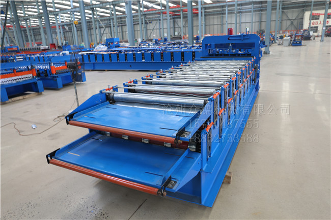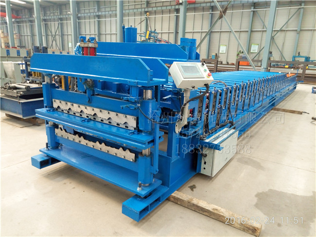 此款双层琉璃瓦压型机器,为一机双型号琉璃瓦压型机,上层加工琉璃瓦,下层加工普通墙面瓦;电机的主功率为4KW,带动力强,该机器的滚轮采用机床加工而成,每个工件的精度!机器组装由钳工,水平测量组装??刂破魑狿LC电脑控制器,加工板材的厚度为0.2-0.8mm,全自动液压模具自动切断,生产,操作简单。