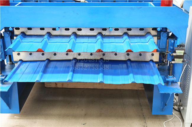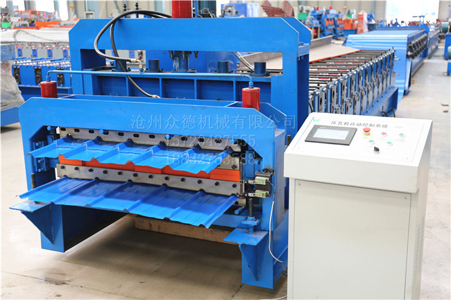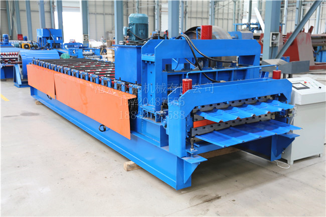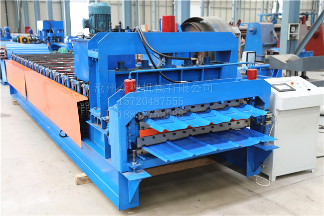 此款双层彩钢琉璃瓦压型机器,为一机双三型号压型机,上层可加工840普通彩钢瓦的同时,还可以加工840型的仿古琉璃瓦,下层加工普通900型墙面瓦;电机的主功率为4KW,带动力强,该机器的滚轮采用机床加工而成,每个工件的精度!机器组装由钳工,水平测量后组装。机器可加工板材厚度为0.2-0.8mm(其他厚度均可定制)。全自动电脑控制,操作简单便捷。
