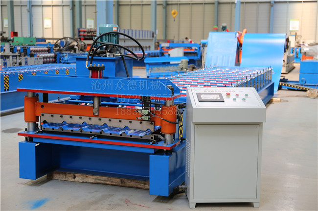 全自动840彩钢板压型机,是一款的彩钢板生产设备,该机器采用计算机控制器程序控制,自动定长,自动切断,配合触控屏操作,简单方便,该机器为全自动PLC电脑编程控制,自动计量长度液压式剪切,断面工整,板型标准!。该机器,制作,设备操作方便,电机功率大,这种机械装有工业控制变频系统,使机器运行加平稳的同时提升了生产的度,成品板型加工整、美观!