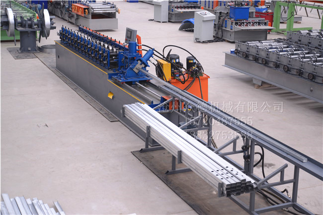 C型隔断龙骨压型设备,为全自动电脑变频控制自动加工生产,是一款高速冷弯成型设备,生产速度每分钟可达30-40米!的同时,机器运行稳定,产品度高;机器操作简单,只需在电脑控制器中数据想要的尺寸数据,一键启动,机器将自动生产,中英文结合,操作简单。每道压辊都搭配手动调节轮,调节方便;板材滚压成型后,机器将自动剪裁,剪裁尺寸,板材断面整齐,无毛刺!